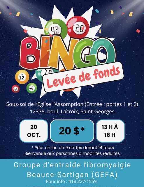 Venez vous amuser à notre évènement BINGO tout en soutenant les gens aux souffrant de fibromyalgie, d’arthrite ou de douleurs chroniques !