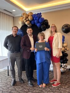 Photo 2 : Député de la Beauce: Daniel Berlinguette Poulin-directeur de bureau de circonscription, Samuel Poulin-Député Beauce Sud et Mélanie Gilbert ainsi que Mme Dany Drouin, directrice générale de l’AFRCA recevant un diplôme de l’assemblée générale.